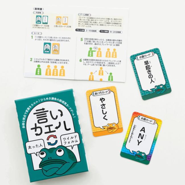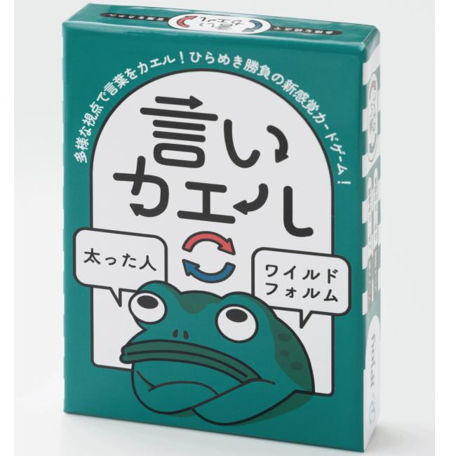 『言いカエル』は、ある言葉を制限条件に従って“言い換える”ことで、お題に沿った面白い・納得感のある表現を競い合う語彙遊びカードゲームです。創造力やユーモアのセンスを働かせながら表現を工夫することで、語彙力とともにコミュニケーション力も育ちます。学習要素と笑いのバランスが絶妙で、子どもも大人も夢中になれるワードセンス育成ゲームです。