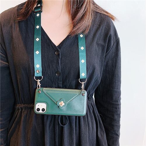 ポシェットのように斜め掛けや首掛けができるネックストラップ付き。